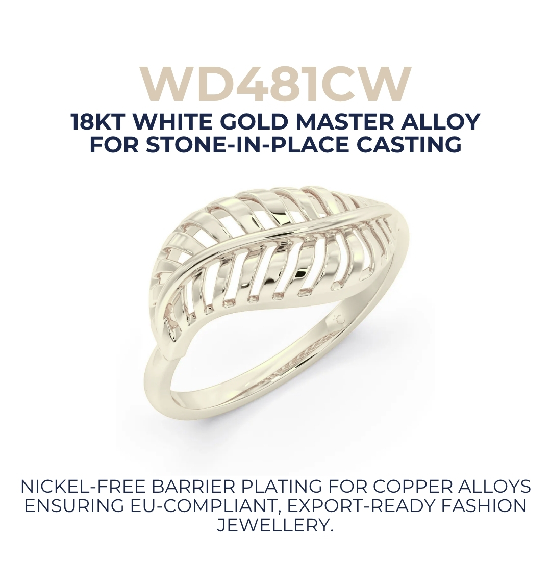 Legor’s WD481CW is an 18KT white gold master alloy built specifically for stone-in-place casting. Not adapted for it. Designed for it.