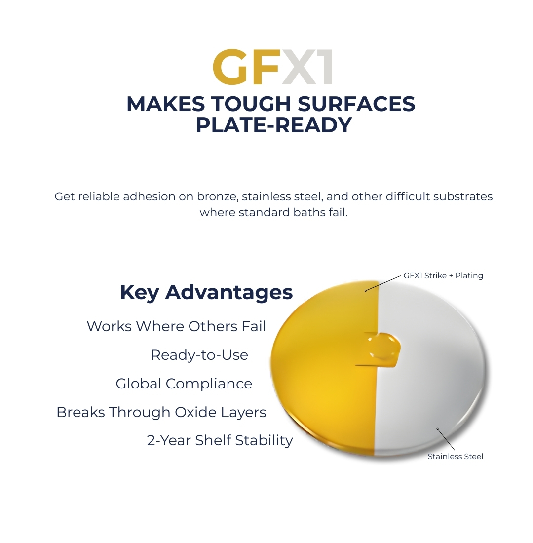 GFX1 is a gold strike solution, not a finish coat. It's the adhesion layer that makes subsequent plating possible on difficult substrates.
